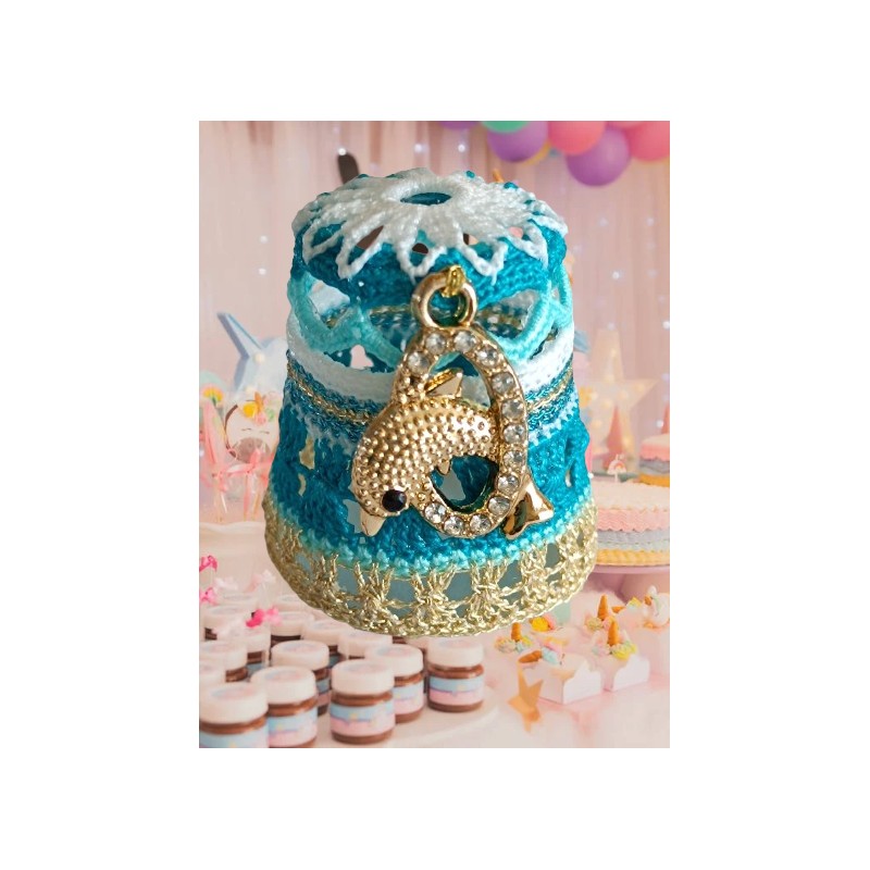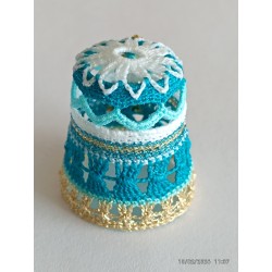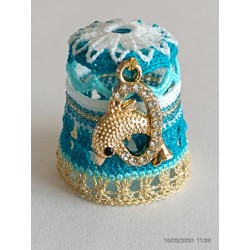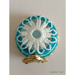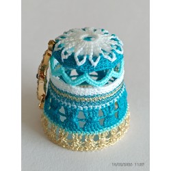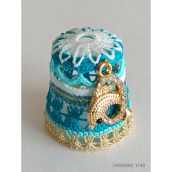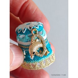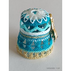Top remarquable avec rabats blancs sur bord ciel - corps point rideau - base fil métal doré clair -
