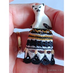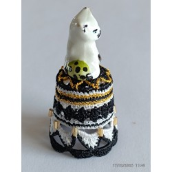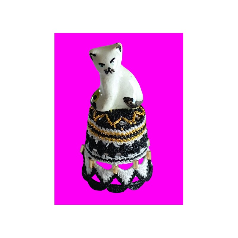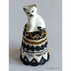 en top un chat blanc assis - Noir gris clair et or - perles longues
