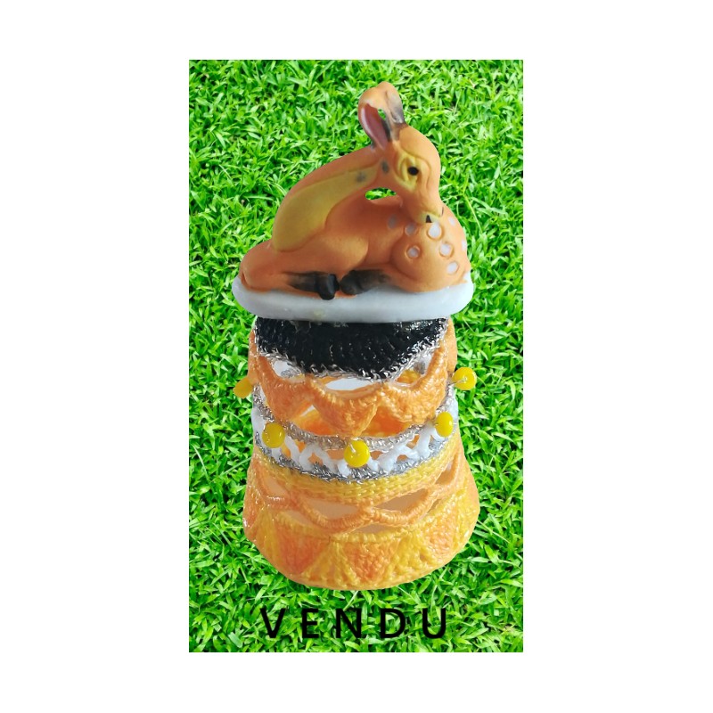En surplomb un faon couché en porcelaine - Bas travaillé bicolore jaune et orange triangles inversés -