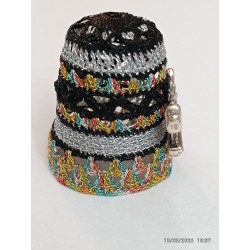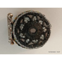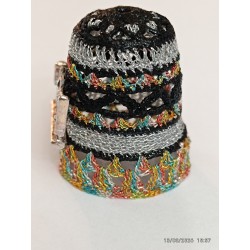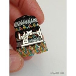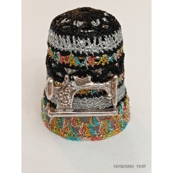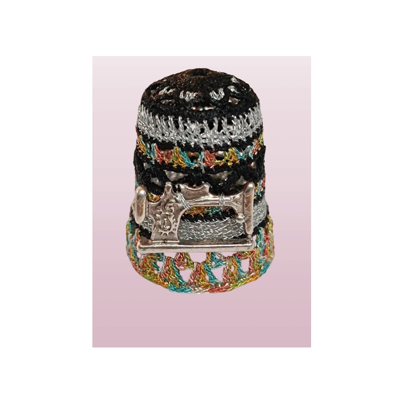 En façade vieille machine Singer. Base fil métal multicolore. Top remarquable pétales argent bordés noir -